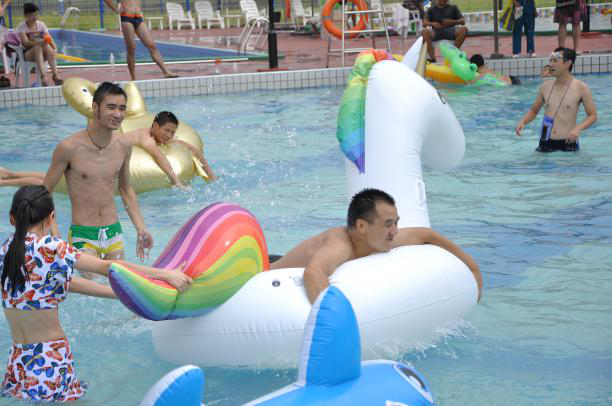隨后,水上趣味接力賽拉開了帷幕。選手們趴在造型各異的動物氣墊上從水上滑梯沖入水中,濺起陣陣?yán)嘶?,然后奮力將氣墊劃向下一個(gè)選手處。把氣墊當(dāng)成小船往前劃非常費(fèi)力,選手們嘗試了各種方法,有用手劃水的,有用腳蹬的,還有手腳并用的,有的還一不小心掉進(jìn)了水里,水池邊的圍觀啦啦隊(duì)們又一次忍俊不禁的開懷大笑。