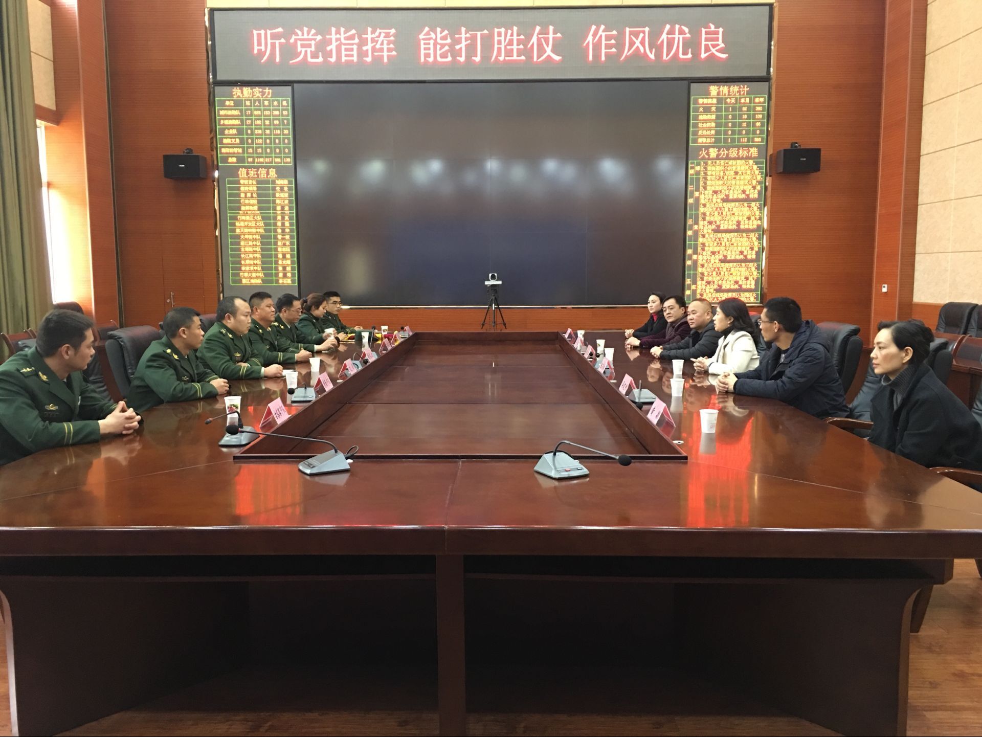 隨后,消防支隊政委胡長友、黨委委員、防火處長歐堪奎、司令部副參謀長文俊和消防官兵代表與陳筱秋總經(jīng)理一行進行了親切的座談。陳總感謝道:春節(jié)前夕,二水廠因取水困難停產(chǎn),造成江北片區(qū)大面積停水,在春節(jié)消防任務(wù)重的情況下,官兵們及時伸出援助之手,為停水區(qū)域進行了送水,對此我們深表感謝。停水片區(qū)的醫(yī)院儲水量告急,古塔路中隊得到消息后,迅速組織消防車輛將30噸水送到了醫(yī)院,保障了重點單位的用水需求。家住七樓行動不便的獨居老人打來電話求助,消防官兵們在隊里找來礦泉水桶裝滿水,扛到七樓送到老人家里。在停水期間,這樣的感人事跡還有很多。